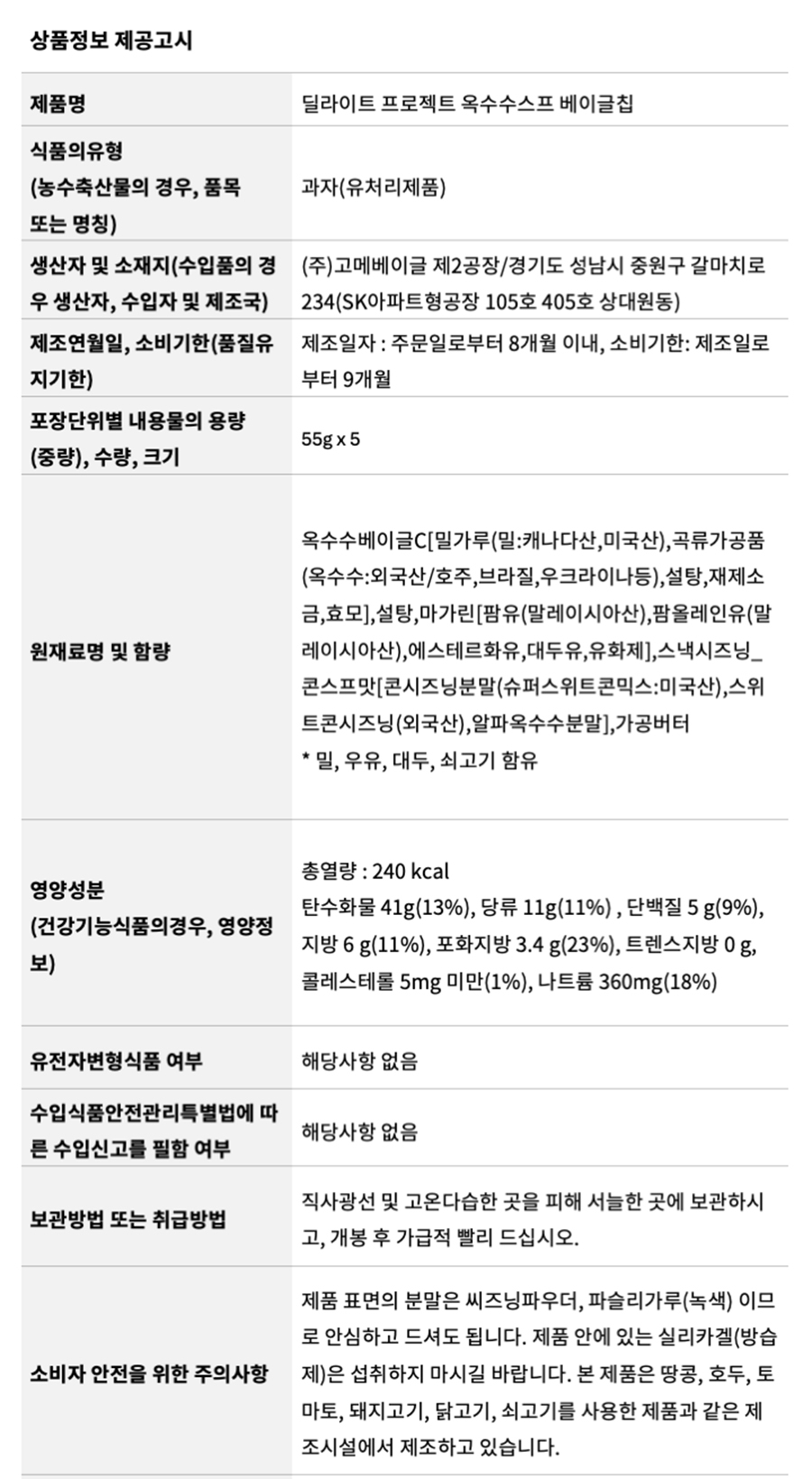 딜라이트 프로젝트 옥수수스프 베이글칩 55g x 5